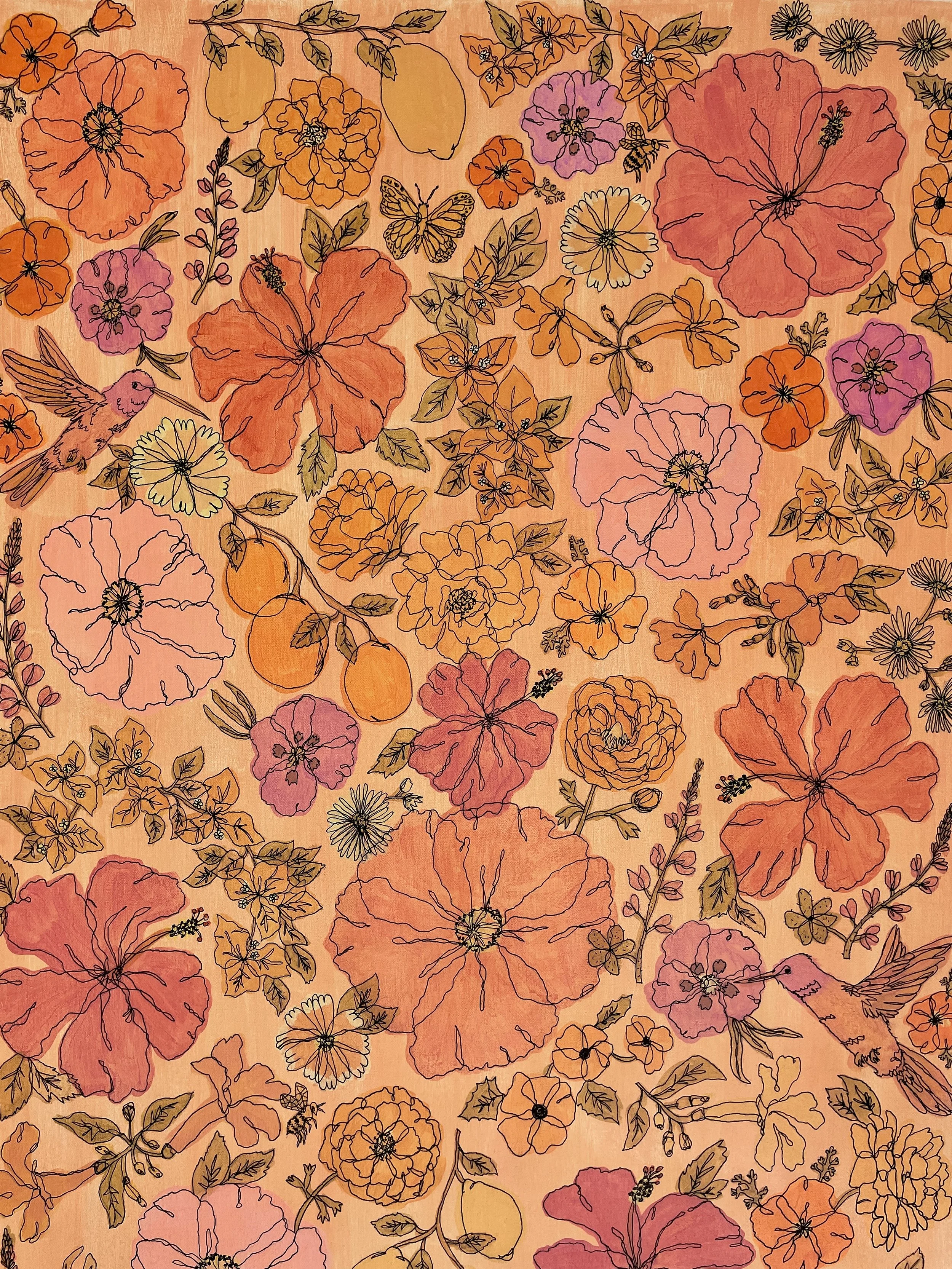 Featuring california flora such as poppies, hibiscus, bougainvillea, tidy-tips, black-eyed susans, rock rose, stinging lupine, lemons and oranges.