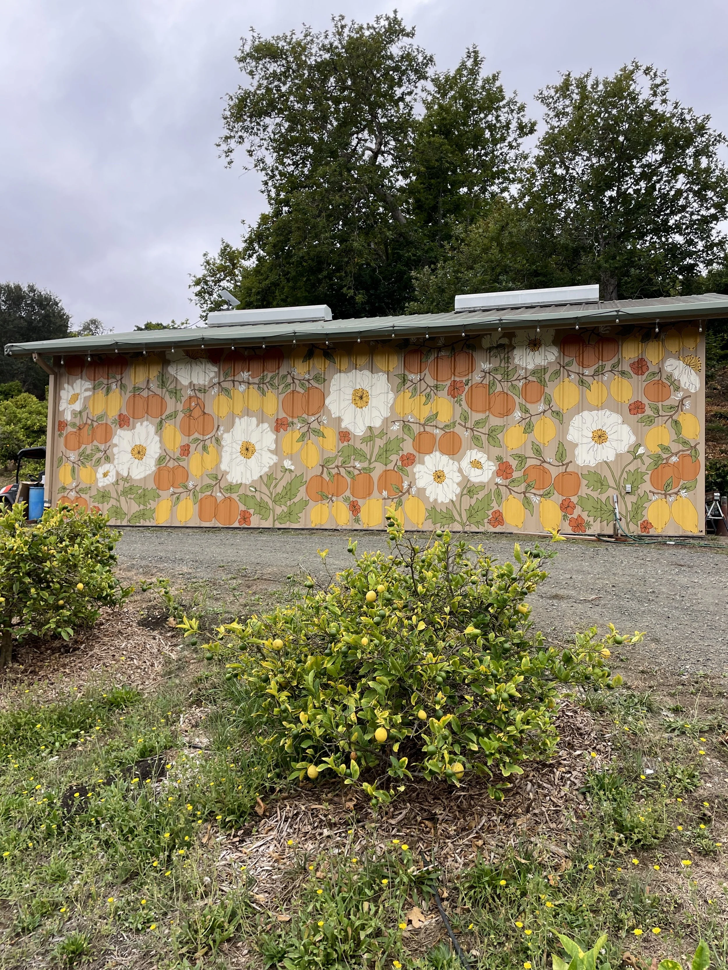 40’ long mural hand-painted at the Stardust Grove Farm in Cambria, CA